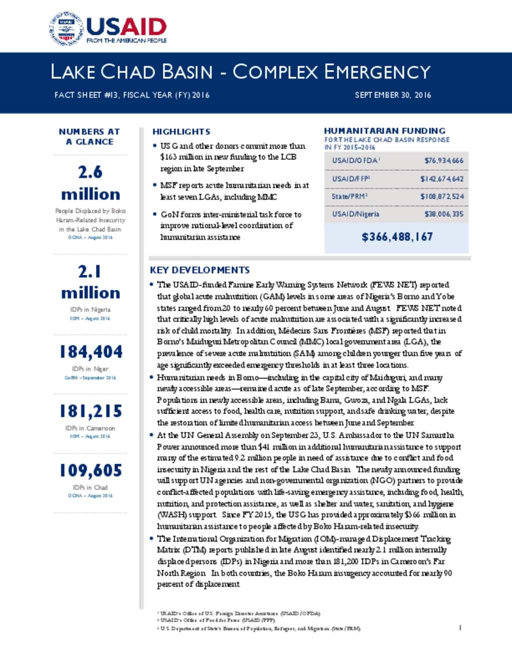 Lake Chad Basin - Complex Emergency Fact Sheet #13, Fiscal Year (FY) 2016