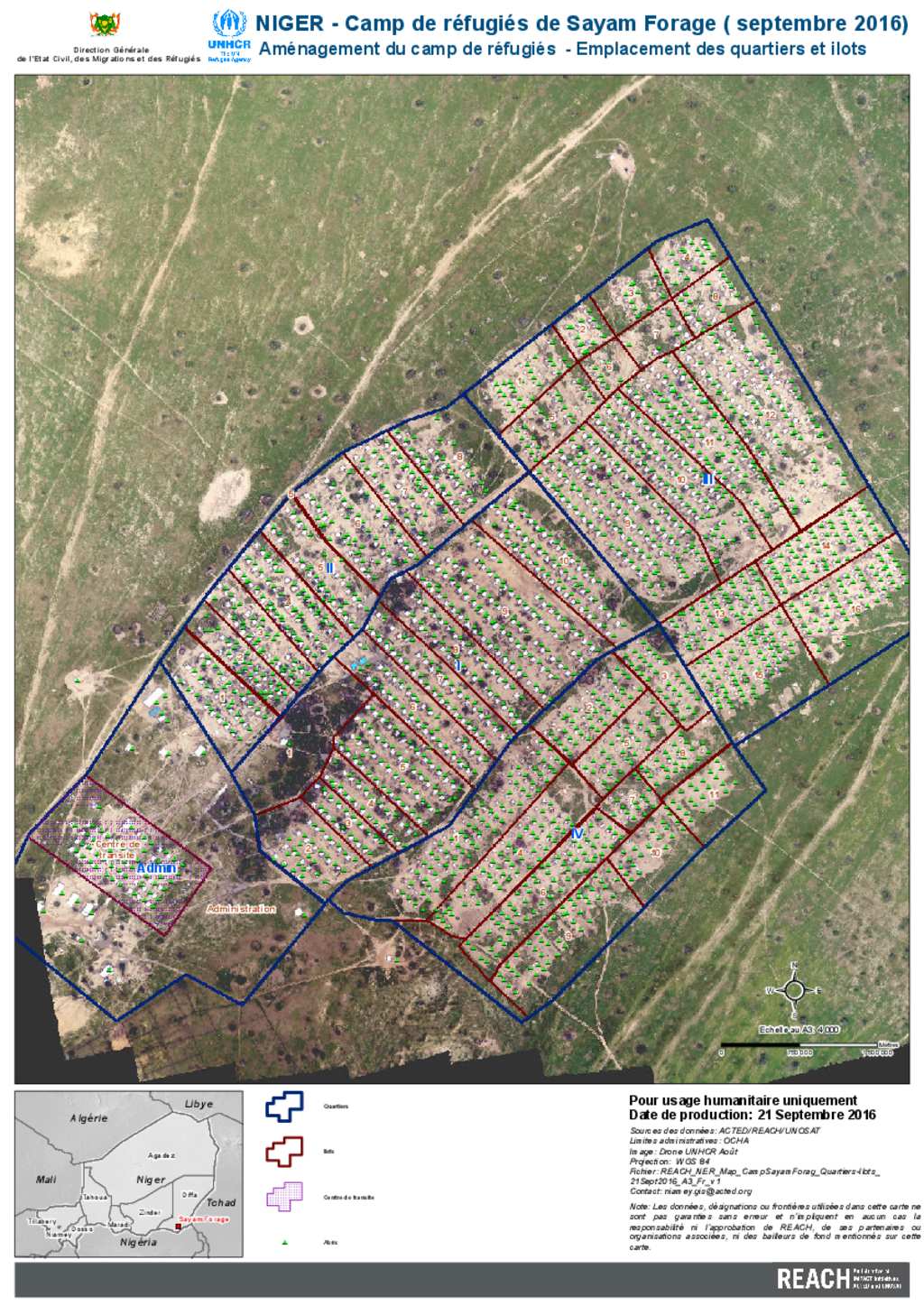 Niger: Carte de camp de Sayam Forage - emplacement des quartiers et ilots - Diffa