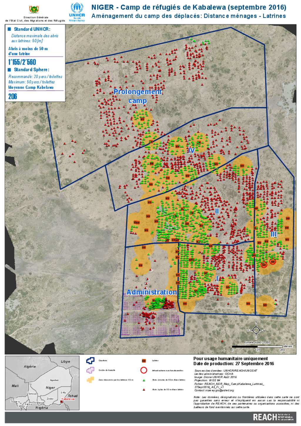 Niger: Carte de camp de Kablewa - Distance menages latrines - Diffa