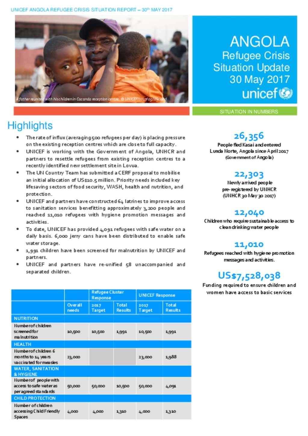UNICEF Angola Refugee Crisis Lunda Norte Situation Report 30 May 2017