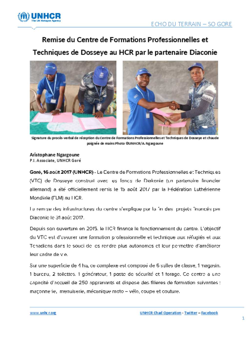 Remise du Centre de Formations Professionnelles et Techniques de Dosseye au HCR