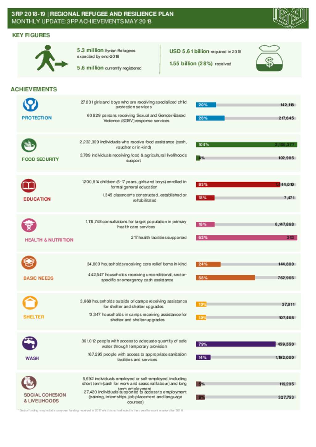 Key regional indicators of achievements in the 3RP Regional Refugee and Resilience Plan.