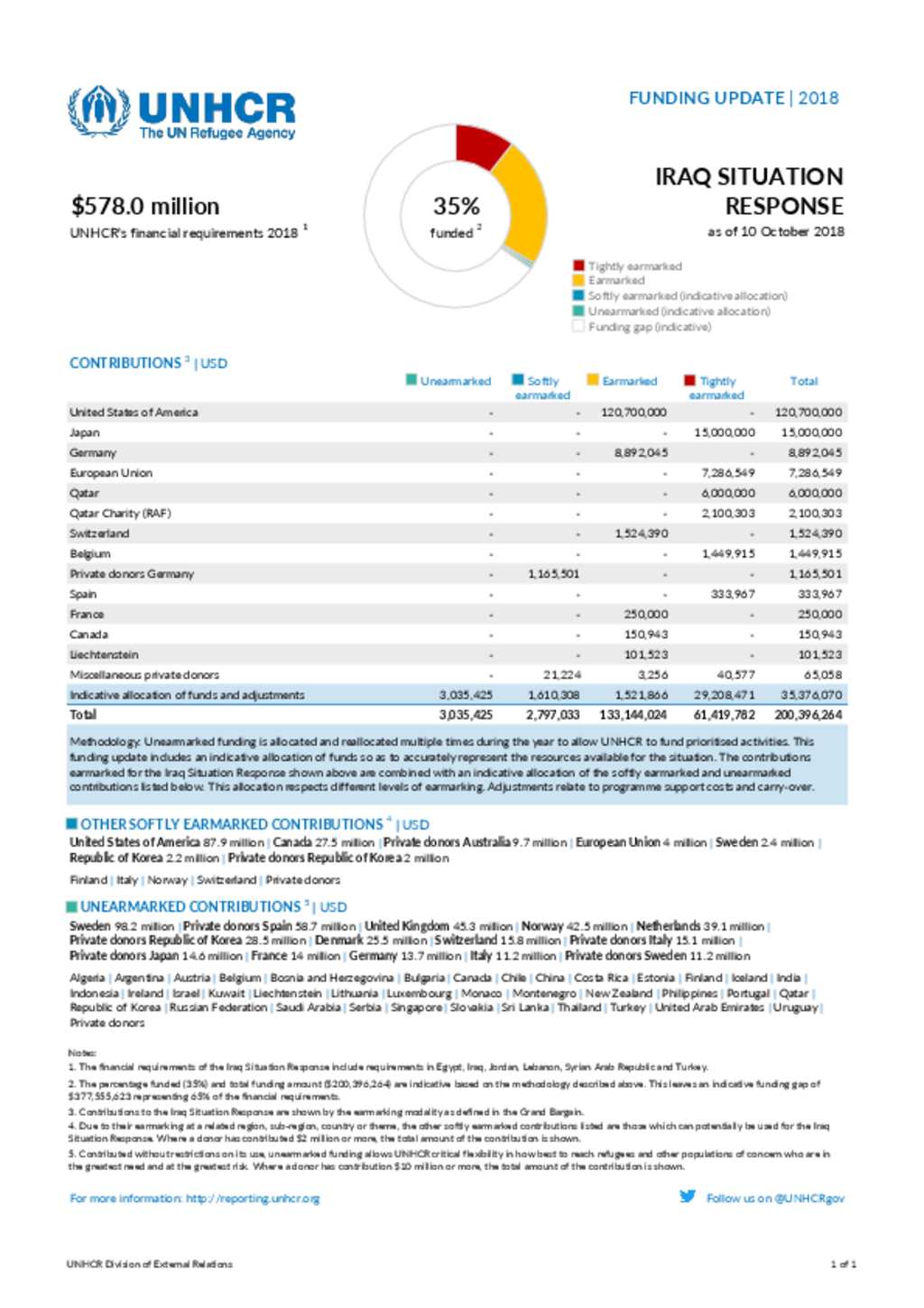The document shows UNHCR Iraq Situation Response Funding Update.