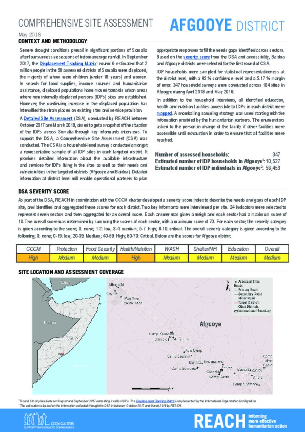 The Comprehensive Site Assessment (CSA) is a household-level survey conducted amongst a representative sample of all IDP sites in each targeted district. It provides detailed information about the available infrastructure and services for IDPs living in the sites as well as their needs and vulnerabilities in the targeted districts (Afgooye and Baidoa).