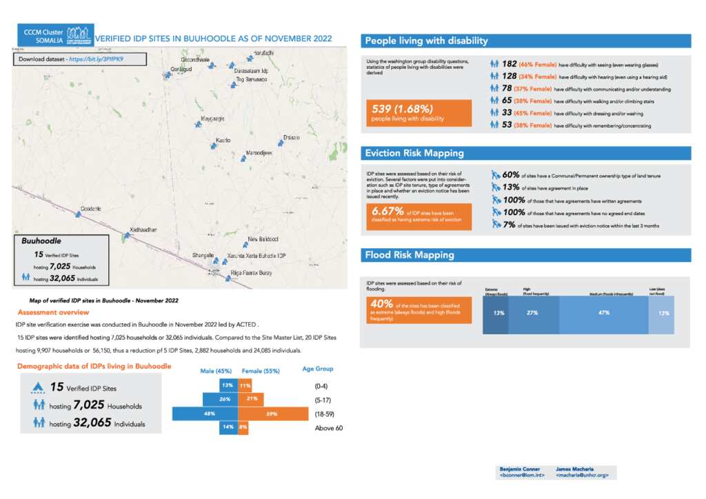 IDP site verification exercise was conducted in Buuhoodle in November 2022 led by ACTED . 15 IDP sites were identified hosting 7,025 households or 32,065 individuals. Compared to the Site Master List, 20 IDP Sites hosting 9,907 households or 56,150, thus a reduction pf 5 IDP Sites, 2,882 households and 24,085 individuals.