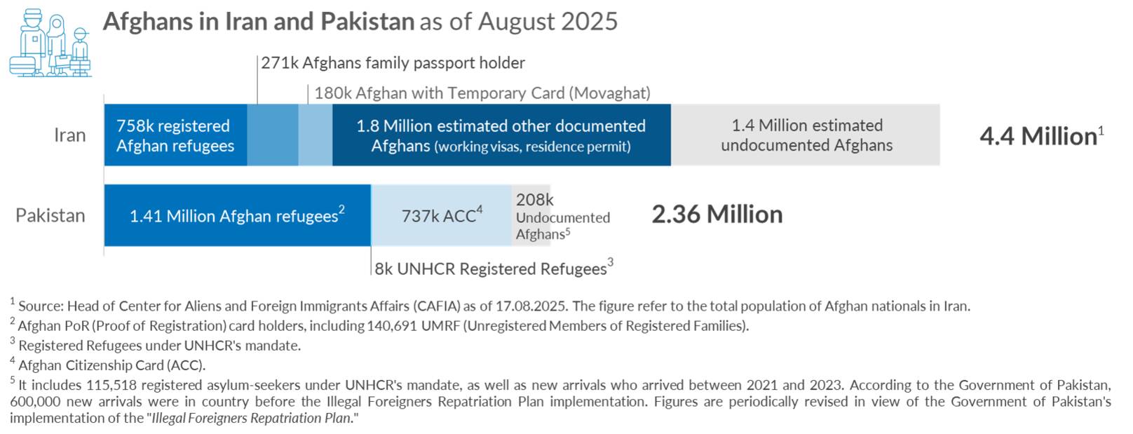 Iran and Pakistan are among the world’s major refugee-hosting countries, hosting 3.47 million and 1.75 million Afghan refugees respectively, despite facing their own challenges. Since 2023, a shift in displacement trends has been taking place that has seen mass returns, including large numbers of forced and coerced returns, back to Afghanistan. On 7 March 2025, the Government of Pakistan announced the resumption of the 'Illegal Foreigners Repatriation Plan', initially targeting Afghan Citizenship Card (ACC) holders, who were instructed to leave voluntarily by 31 March or face deportation from 1 April. On 31 July, the Government expanded the plan to also include Afghan refugees holding Proof of Registration (PoR) cards. In parallel, following Headcount slip expiry on 20 March 2025, the Government of Iran launched a regularization/return scheme for some two million affected Afghans where the majority were expected to return to Afghanistan by the Government deadline of 6 July 2025 or face deportation. These mass returns in adverse circumstances have strained Afghanistan’s already overstretched resources and services and hindered reintegration efforts, leading to risks of onward and new displacement, including return movements back into Pakistan and Iran and onward. UNHCR reiterates its concern that many Afghans – regardless of status – face serious protection risks in Afghanistan due to the current human rights situation, especially women and girls. These risks are made more urgent by critical funding shortfalls, with only 24% of the required $478 million secured for the Afghanistan situation. This page provides updates on UNHCR's work in support of Afghan IDPs, refugees, and returnees. Links are also provided below for individual UNHCR country operation pages for additional information.