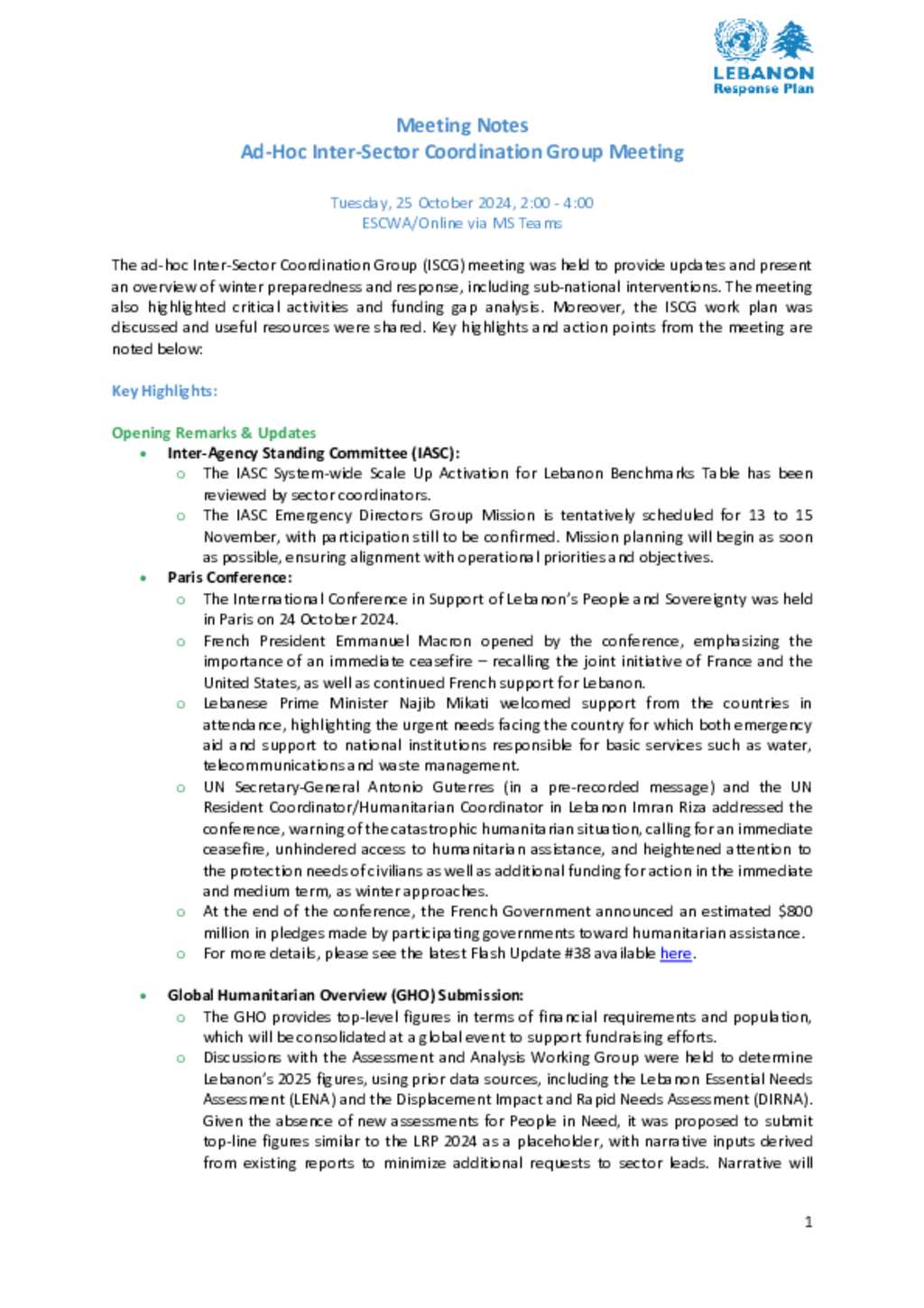 Lebanon: Ad-Hoc Inter-Sector Coordination Group Meeting Notes - 25 October 2024