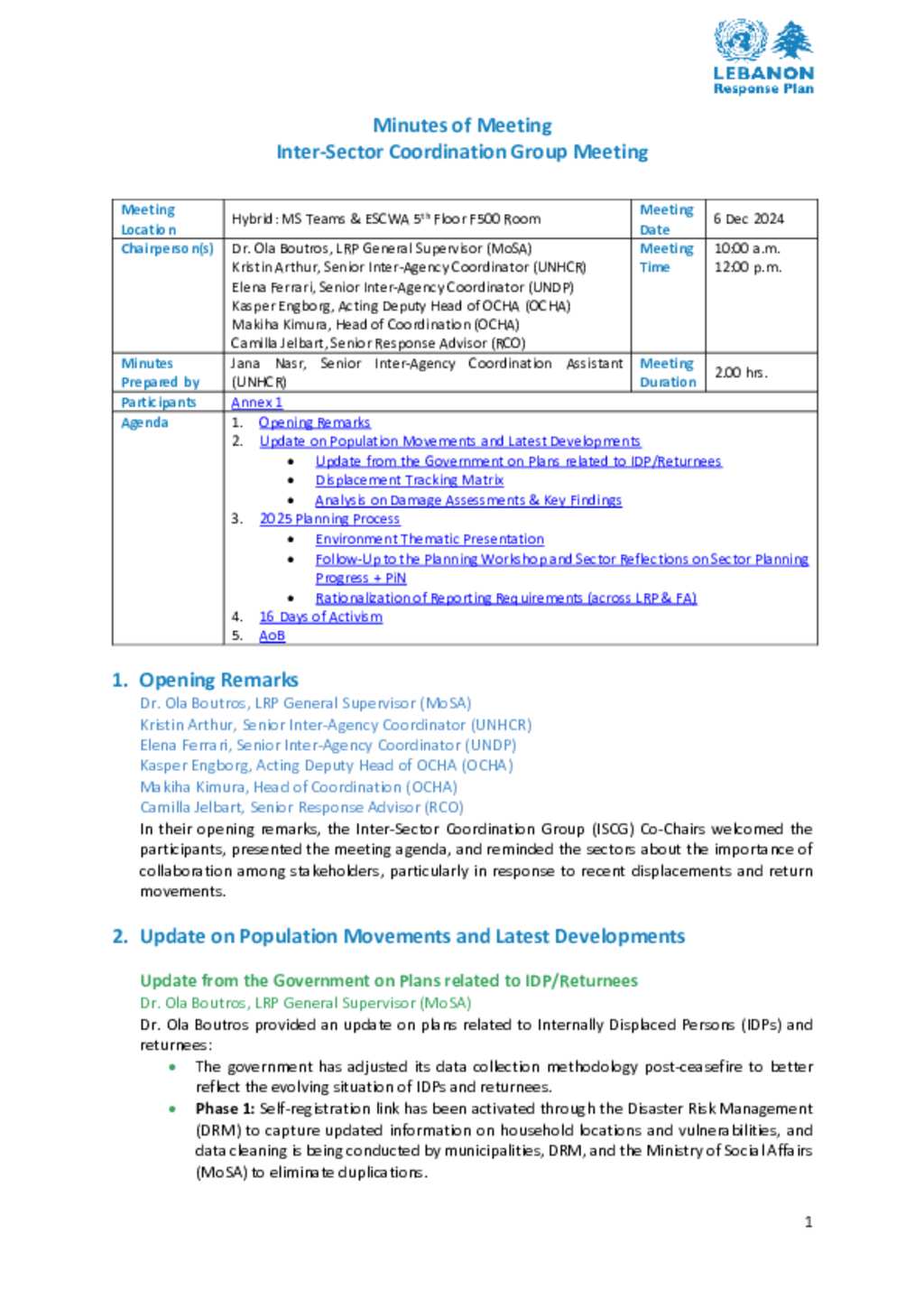 Lebanon: Inter-Sector Coordination Group Minutes of Meeting - 6 December 2024