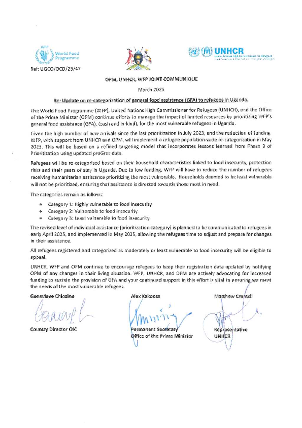 Update on re-categorization of general food assistance (GFA) to refugees in Uganda