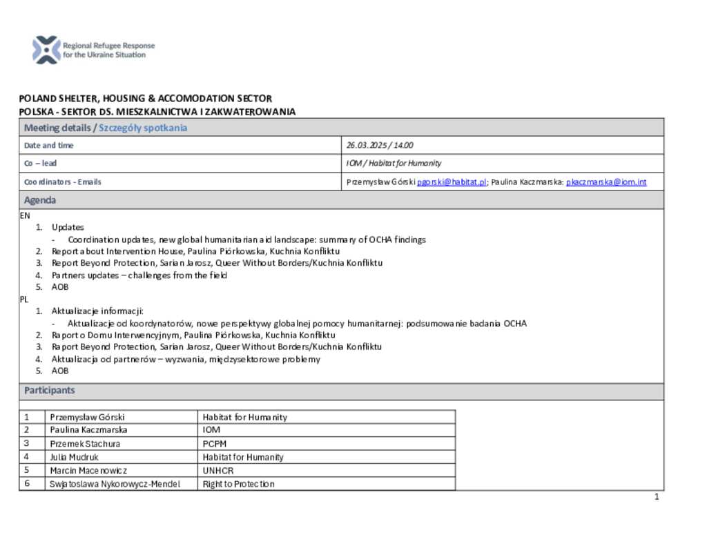 Poland: Shelter, Housing & Accommodation Sector Meeting Minutes (26 March 2025)