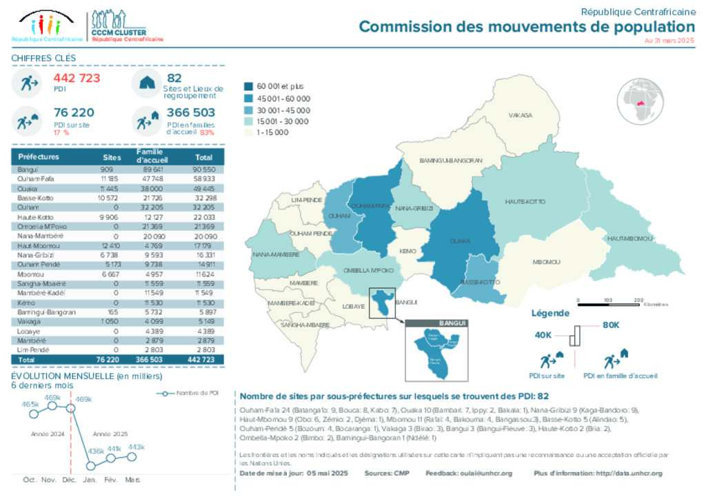 La Commission Mouvement de Populations (CMP) est un mécanisme inter-organisationnel dont l’objectif est de fournir des données chiffrées et les tendances des déplacements de la population en RCA sur une base mensuelle.