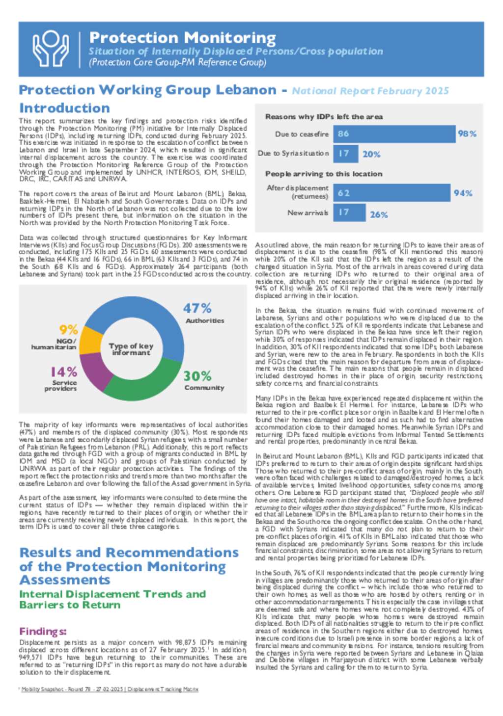This report summarizes the key findings and protection risks identified through the Protection Monitoring (PM) initiative for Internally Displaced Persons (IDPs), including returning IDPs, conducted during February 2025. This exercise was initiated in response to the escalation of conflict between Lebanon and Israel in late September 2024, which resulted in significant internal displacement across the country. The exercise was coordinated through the Protection Monitoring Reference Group of the Protection Working Group and implemented by UNHCR, INTERSOS, IOM, SHEILD, DRC, IRC, CARITAS and UNRWA.