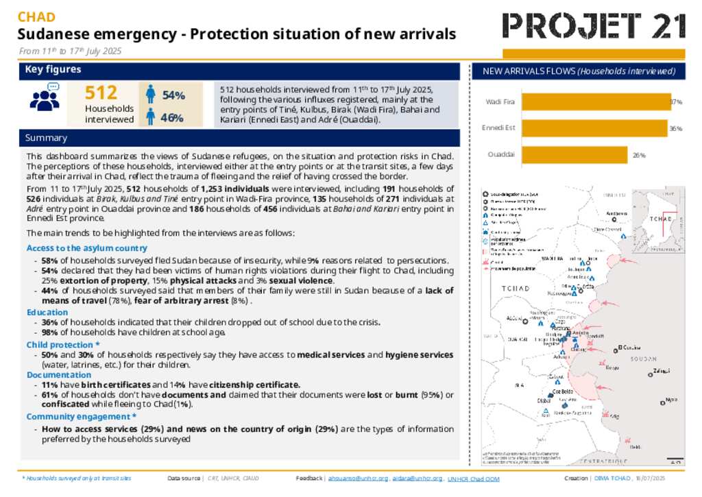 This dashboard summarizes the views of Sudanese refugees, on the situation and protection risks in Chad. The perceptions of these households, interviewed either at the entry points or at the transit sites, a few days after their arrival in Chad, reflect the trauma of fleeing and the relief of having crossed the border. From 27th June to 3rd July 2025, 951 households of 2,721 individuals were interviewed, including 1,205 households of 821 individuals at Birak, Kulbus and Tiné entry point in Wadi-Fira province, 176 households of 558 individuals at Adré entry point in Ouaddai province and 433 households of 958 individuals at Bahai and Kariari entry point in Ennedi Est province.