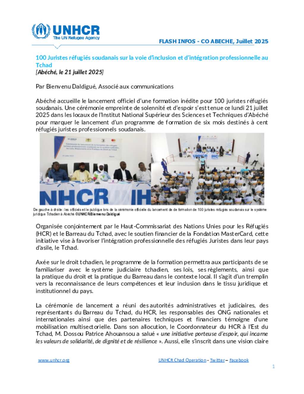 Flash Update #18 Formation de 100 Juristes réfugiés soudanais sur la voie d’inclusion et d’intégration professionnelle au Tchad