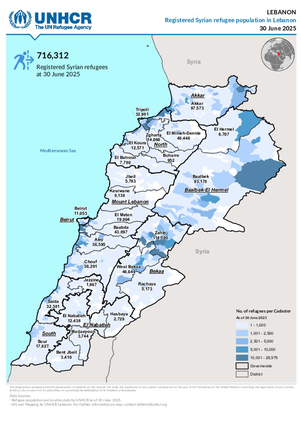 UNHCR - Registration - Lebanon - Map of Registered Syrian Refugees by District in Lebanon - 30/06/2025