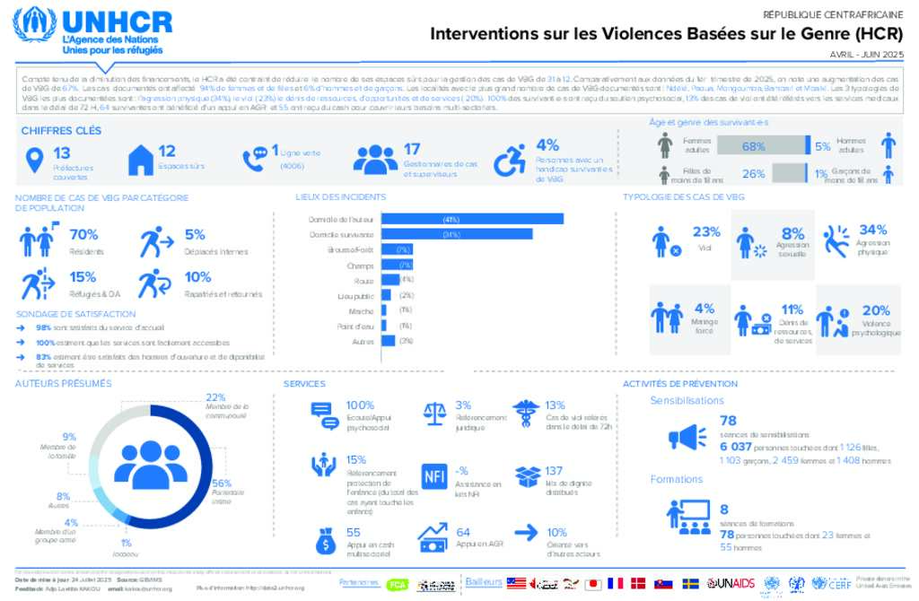 Dashboard du 2e trimestre de l’année 2025 (Avril - Juin 2025) récapitulant les interventions du HCR et de ses partenaires Finn Church Aid (FCA) et CIAUD relatives aux VBG.