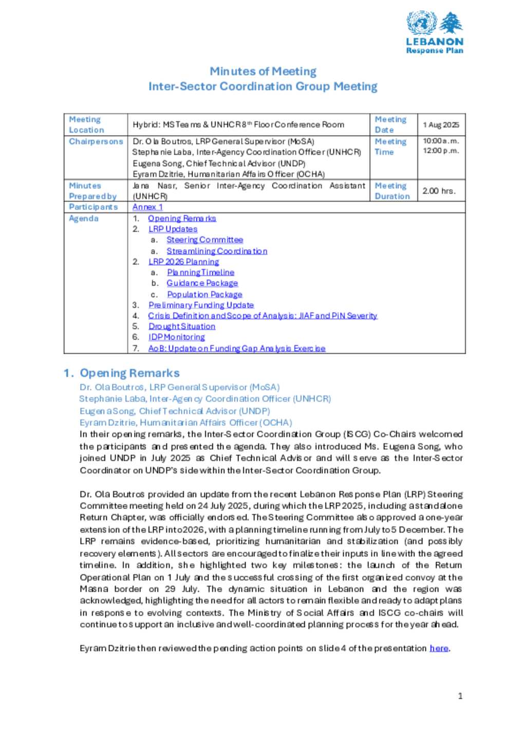 Lebanon: Inter-Sector Coordination Group Minutes of Meeting - 1 August 2025