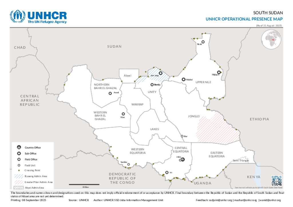 South Sudan - UNHCR Operational Presence Map - 31 August 2025