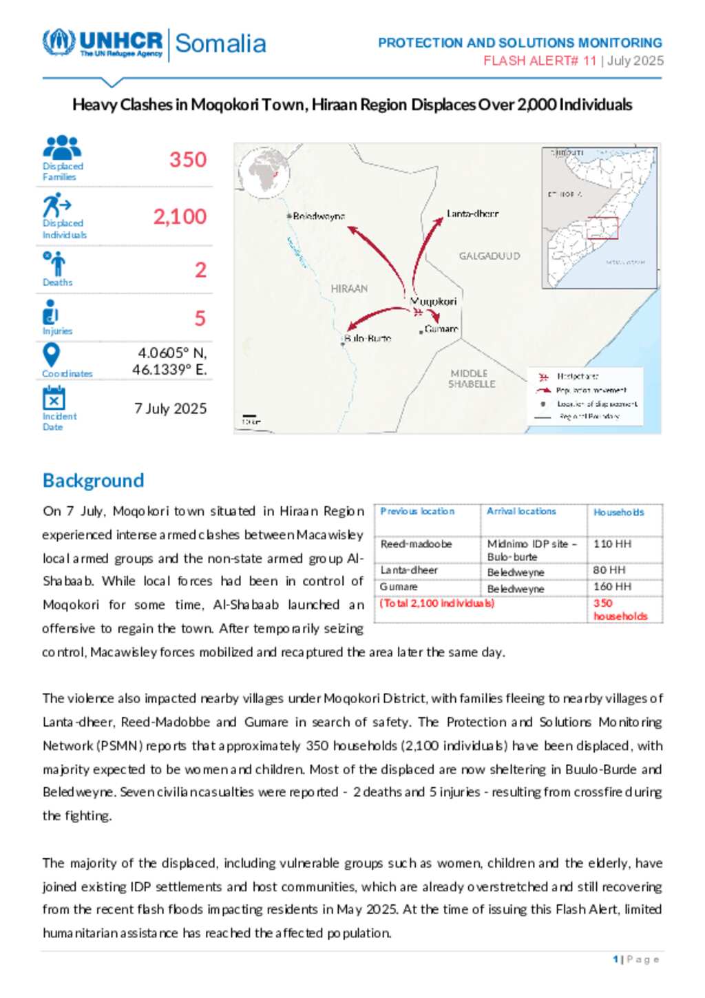 UNHCR Somalia Flash Alert #11- Heavy Clashes in Moqokori District Hiraan Region Displace Over 2000 Individuals