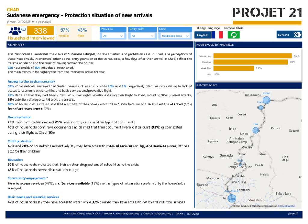 This dashboard summarizes the views of Sudanese refugees, on the situation and protection risks in Chad. The perceptions of households interviewed either at the entry points or at the transit sites, a few days after their arrival in Chad, reflect the trauma of fleeing and the relief of having crossed the border. 338 households of 854 individuals interviewed.
