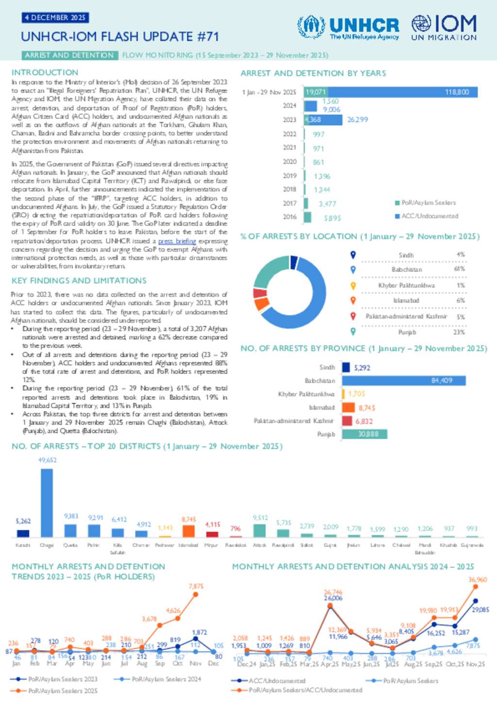 UNHCR-IOM Pakistan Flash update # 71 on Arrest and Detention/Flow Monitoring, 15 Sep 2023 to 29 November 2025