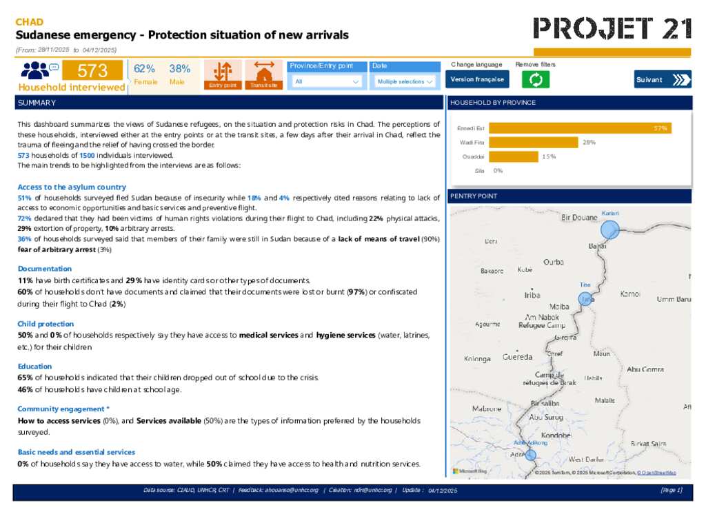 This dashboard summarizes the views of Sudanese refugees, on the situation and protection risks in Chad. The perceptions of households interviewed either at the entry points or at the transit sites, a few days after their arrival in Chad, reflect the trauma of fleeing and the relief of having crossed the border. 573 households of 1,500 individuals interviewed.