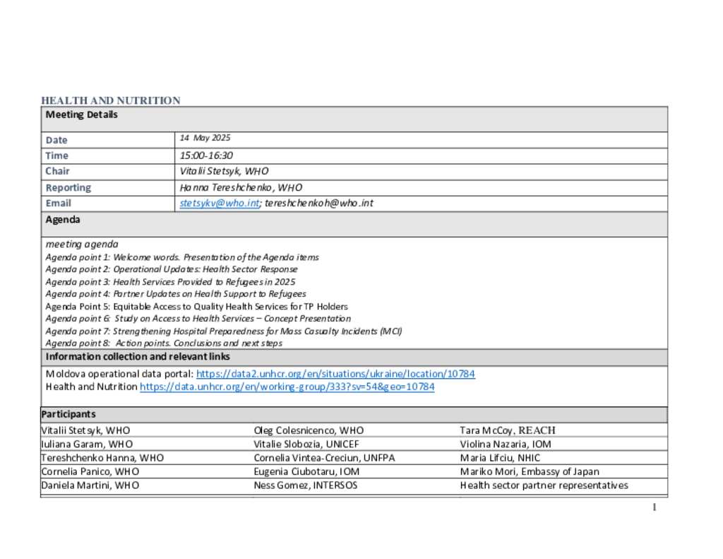 Ukraine situation: Moldova: Health and Nutrition Working Group Meeting Minutes (14 May 2025)