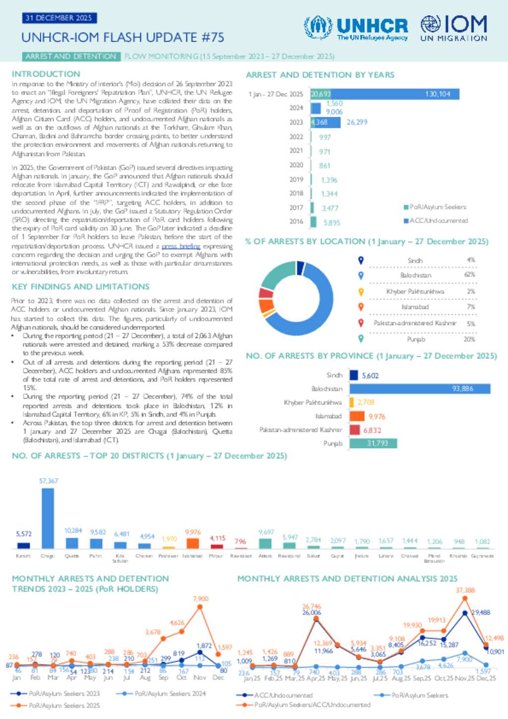UNHCR-IOM Pakistan Flash update # 75 on Arrest and Detention/Flow Monitoring, 15 Sep 2023 to 27 December 2025