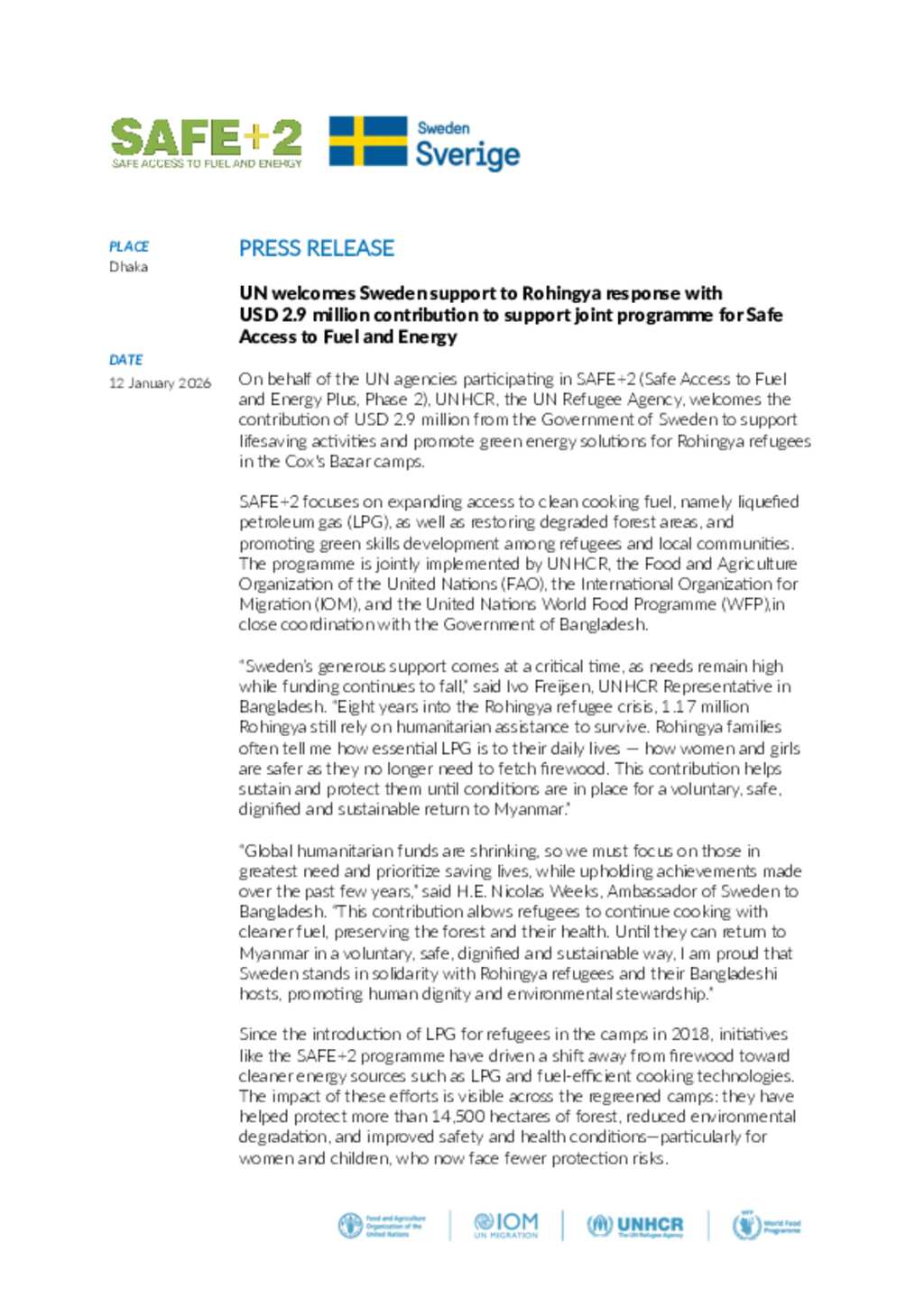 On behalf of the UN agencies par4cipa4ng in SAFE+2 (Safe Access to Fuel and Energy Plus, Phase 2), UNHCR, the UN Refugee Agency, welcomes the contribution of USD 2.9 million from the Government of Sweden to support lifesaving activities and promote green energy solutions for Rohingya refugees in the Cox's Bazar camps.
