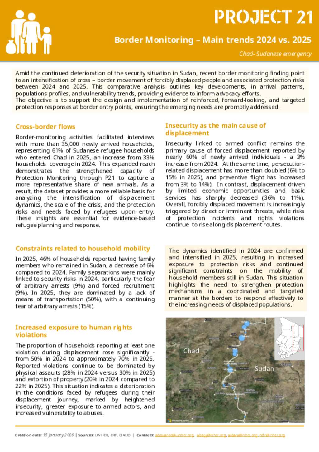 Amid the continued deterioration of the security situation in Sudan, recent border monitoring finding point to an intensification of cross – border movement of forcibly displaced people and associated protection risks between 2024 and 2025. This comparative analysis outlines key developments, in arrival patterns, populations profiles, and vulnerability trends, providing evidence to inform advocacy efforts. The objective is to support the design and implementation of reinforced, forward-looking, and targeted protection responses at border entry points, ensuring the emerging needs are promptly addressed.