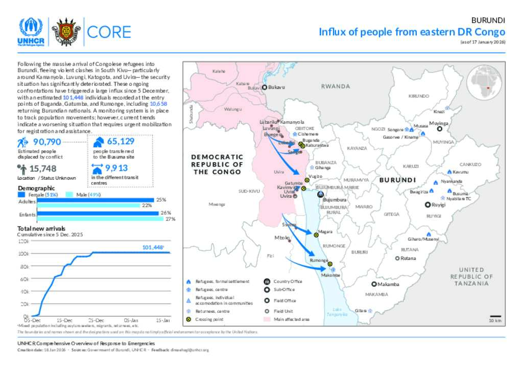 Following the mass arrival of Congolese refugees in Burundi, fleeing violent clashes in South Kivu, particularly around Kamanyola, Luvungi, Katogota and Uvira, the security situation has deteriorated significantly. These clashes have caused a significant influx since 5 December, with thousands of people entering Burundi at the entry points of Buganda, Gatumba and Rumonge. A counting system is in place to track movements, but the trend indicates a worsening situation requiring urgent mobilisation for registration and assistance.