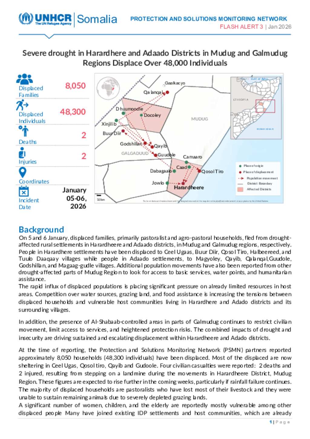 On 5 and 6 January, displaced families, primarily pastoralist and agro-pastoral households, fled from drought-affected rural settlements in Harardheere and Adaado districts, in Mudug and Galmudug regions, respectively. People in Harardhere settlements have been displaced to Ceel Ugaas, Buur Diir, Qosol Tiro, Halbeereed, and Tuulo Daaqaay villages while people in Adaado settlements, to Magyoley, Qayib, Qalanqal,Guudole, Godshillan, and Magaag-gudle villages.