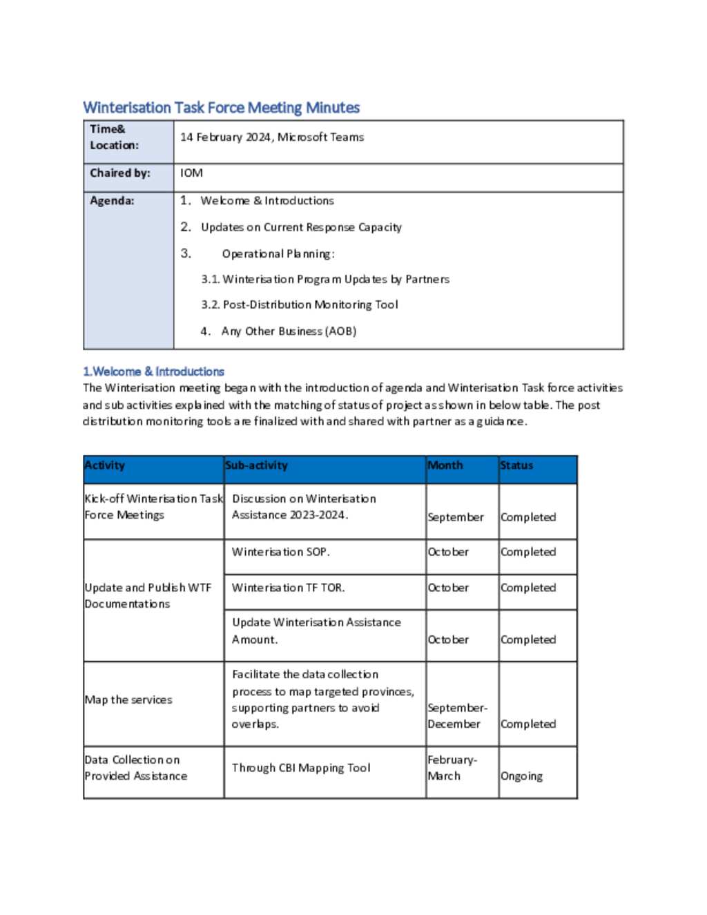Türkiye: Winterisation Task Force 14.02.2024 Meeting Minutes
