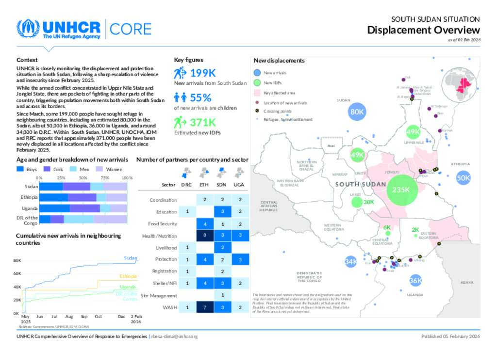 Since March, some 199,000 people have sought refuge in neighbouring countries, including an estimated 80,000 in the Sudan, about 50,000 in Ethiopia, 36,000 in Uganda, and around 34,000 in D.R.C. Within South Sudan, UNHCR, UNOCHA, IOM and RRC reports that approximately 371,000 people have been newly displaced in all locations affected by the conflict since February 2025.