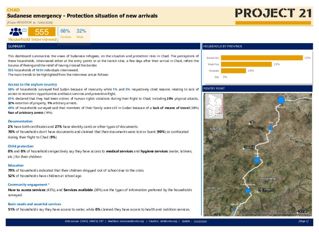 This dashboard summarizes the views of Sudanese refugees, on the situation and protection risks in Chad. The perceptions of households interviewed either at the entry points or at the transit sites, a few days after their arrival in Chad, reflect the trauma of fleeing and the relief of having crossed the border. 555 households of 1,614 individuals interviewed.