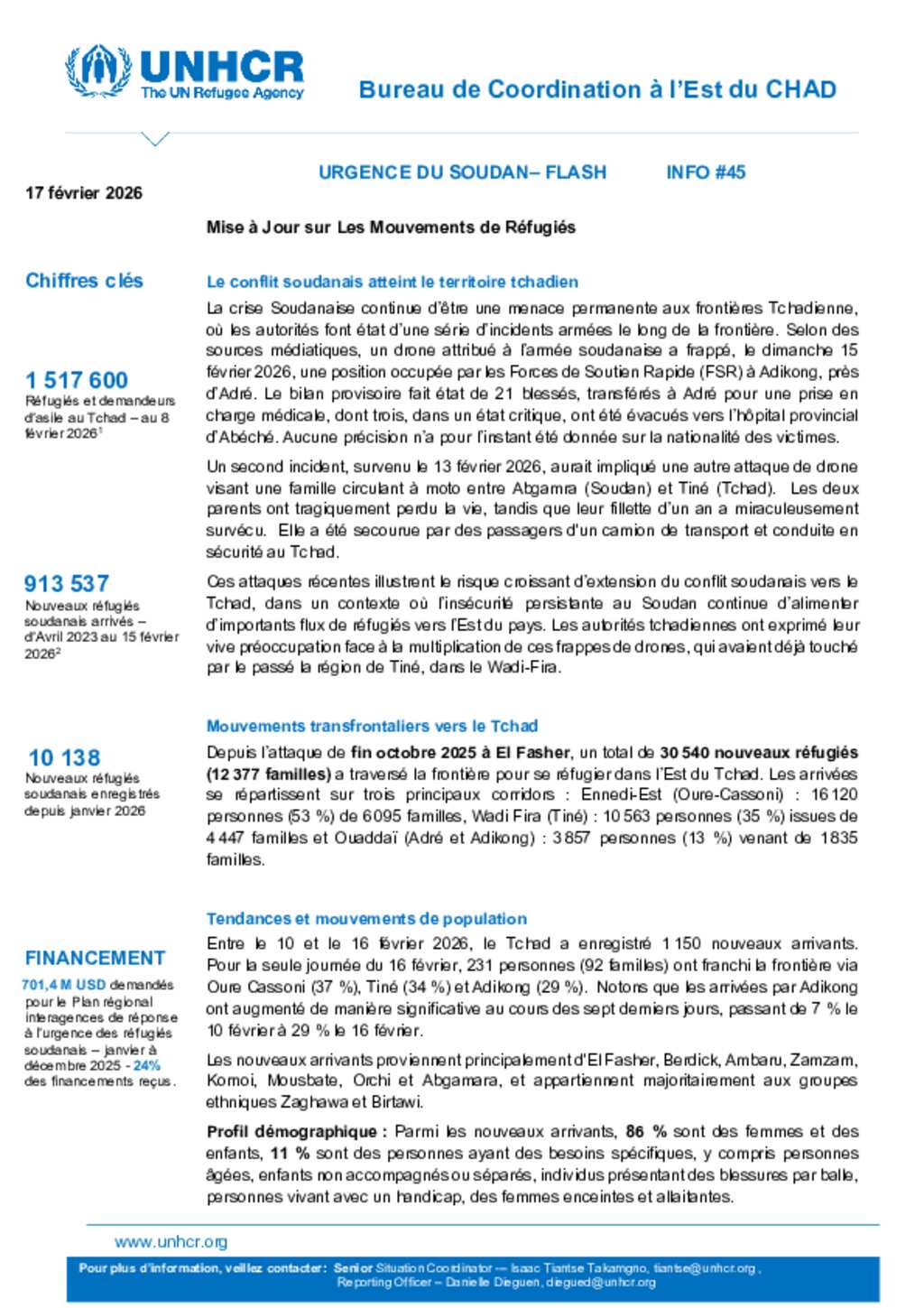 Flash Update #45 Nouvel afflux de réfugiés soudanais au Tchad
