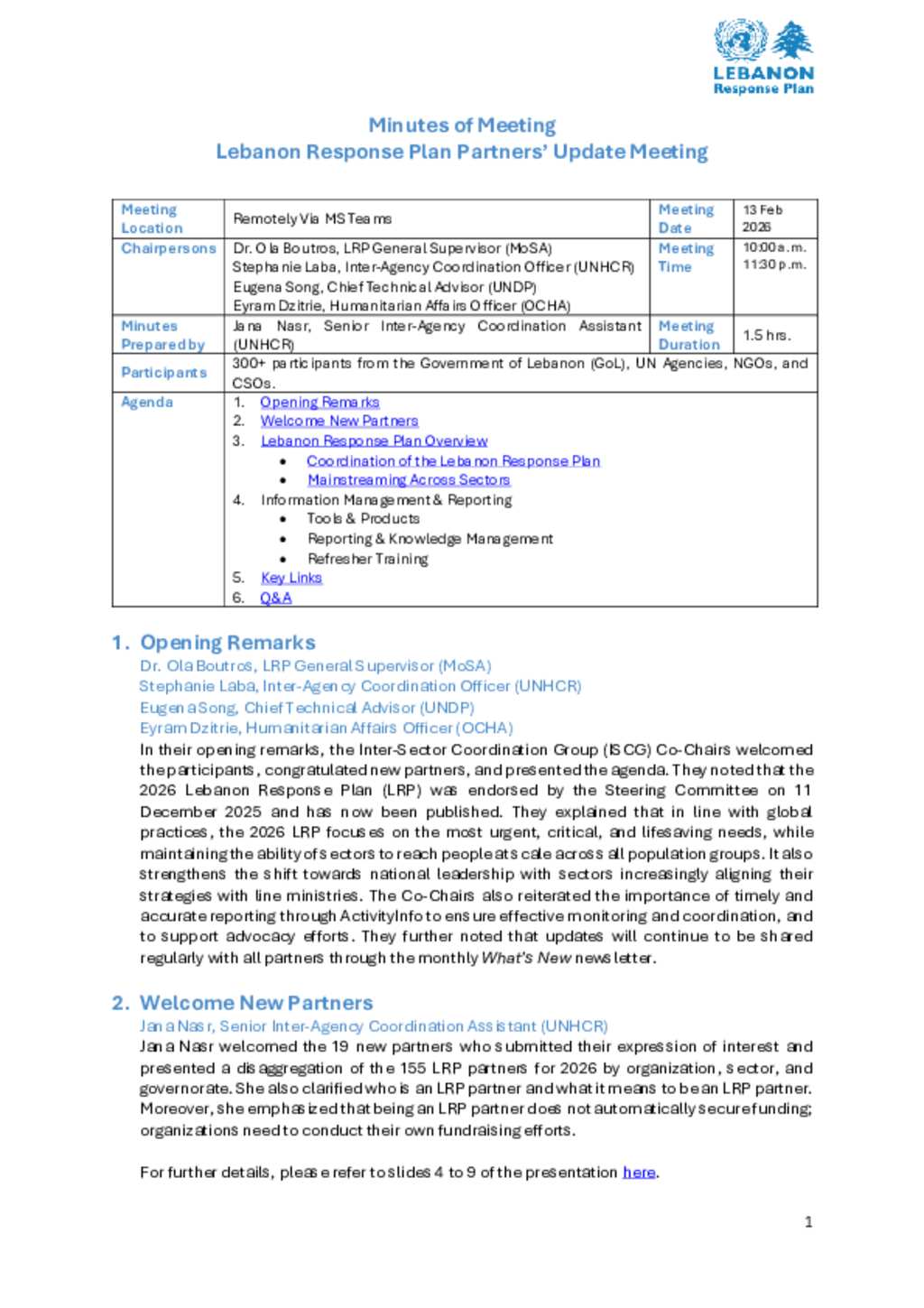 Lebanon: LRP Partners Update Minutes of Meeting - 13 February 2026