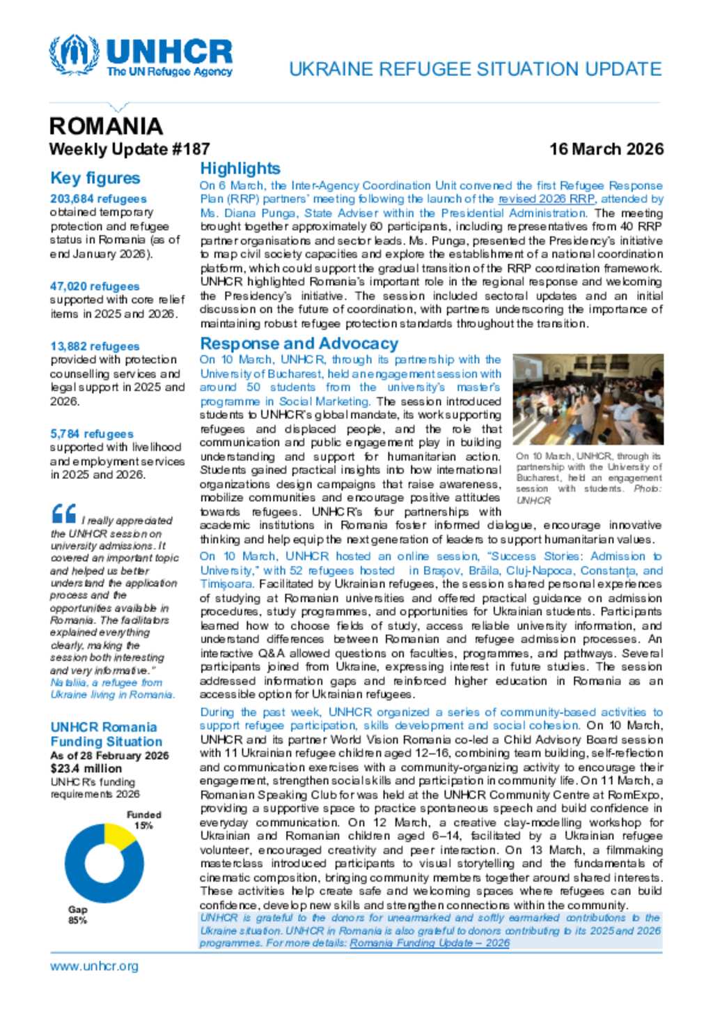 UNHCR Romania Ukraine Refugee Situation Update - 16 March 2026