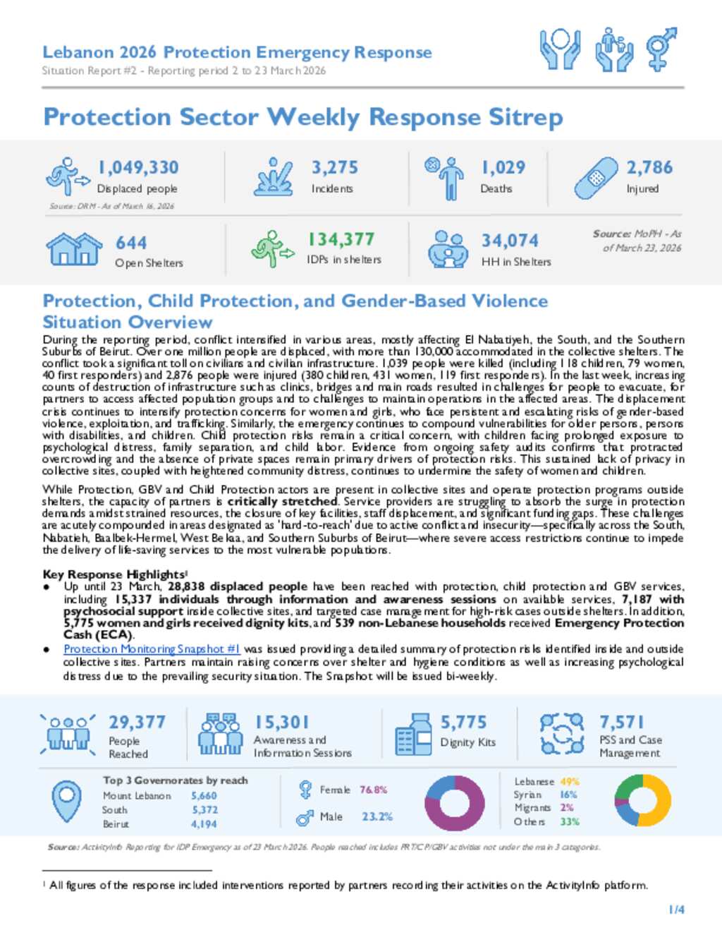 This Situation Report (#2) provides an overview of the Protection Sector emergency response in Lebanon covering the period 2 to 23 March 2026. Amid escalating conflict, displacement has surpassed one million people, with significant humanitarian consequences, including civilian casualties, widespread infrastructure damage, and increasing barriers to access for affected populations. The report highlights heightened protection risks, particularly for women, children, persons with disabilities, and other vulnerable groups, with growing concerns around gender-based violence, psychological distress, and child protection issues. The report outlines key response achievements across Protection, Child Protection, and Gender-Based Violence (GBV), including the delivery of psychosocial support, awareness sessions, dignity kits, and emergency protection cash assistance. It also details ongoing efforts to scale up community engagement, protection monitoring, and service delivery in both collective shelters and host comm