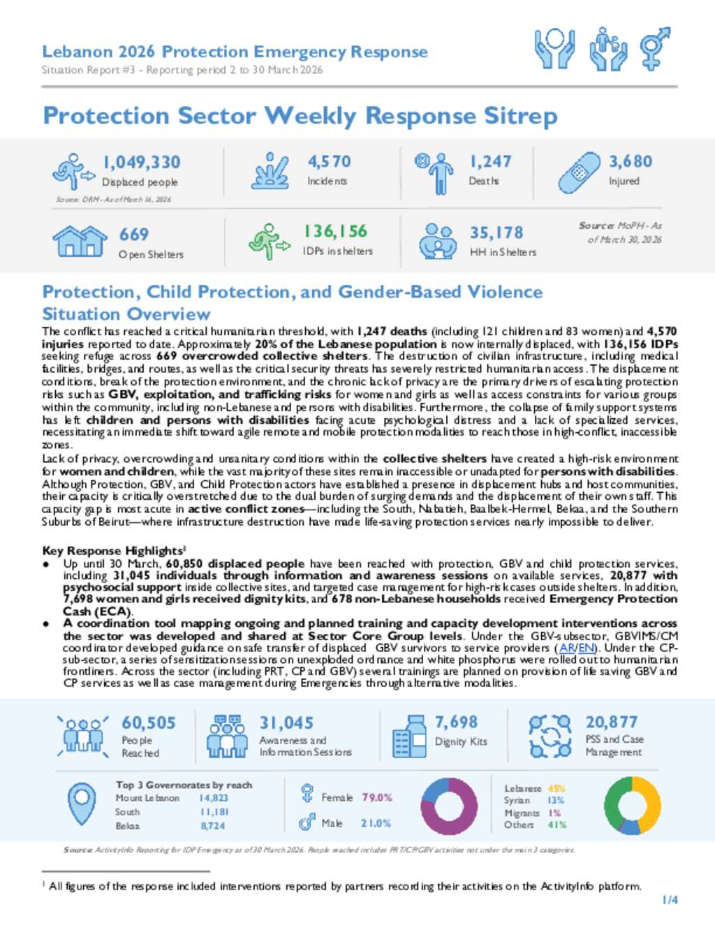 This Situation Report (#3) presents an overview of the Protection Sector emergency response in Lebanon for the period 2 to 30 March 2026. The report highlights a rapidly deteriorating humanitarian situation, with conflict reaching a critical threshold marked by rising casualties, large-scale displacement, and severe damage to civilian infrastructure. Approximately 20% of the population is now displaced, with overcrowded shelters and restricted humanitarian access significantly exacerbating protection risks, particularly for women, children, persons with disabilities, and other vulnerable groups. It outlines key response achievements across Protection, Child Protection, and Gender-Based Violence (GBV), including expanded outreach, psychosocial support, case management, dignity kit distribution, and emergency cash assistance. The report also highlights the scale-up of remote and mobile service delivery modalities, as well as strengthened coordination, monitoring, and capacity-building efforts to adapt to acce