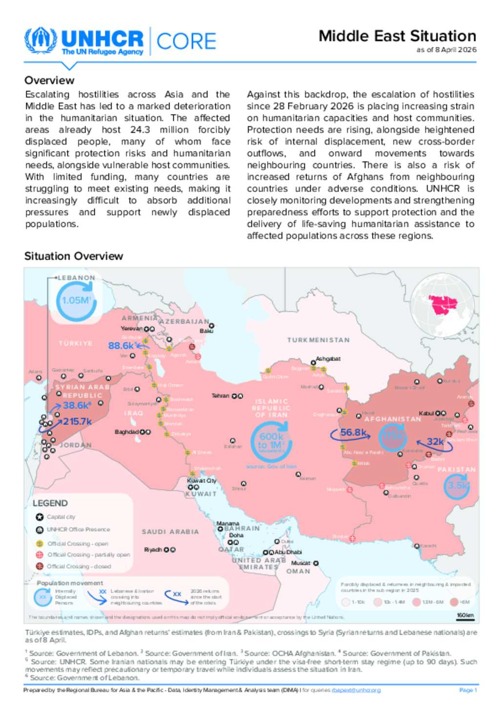 Escalating hostilities across Asia and the Middle East has led to a marked deterioration in the humanitarian situation. The affected areas already host 24.3 million forcibly displaced people, many of whom face significant protection risks and humanitarian needs, alongside vulnerable host communities. With limited funding, many countries are struggling to meet existing needs, making it increasingly difficult to absorb additional pressures and support newly displaced populations.