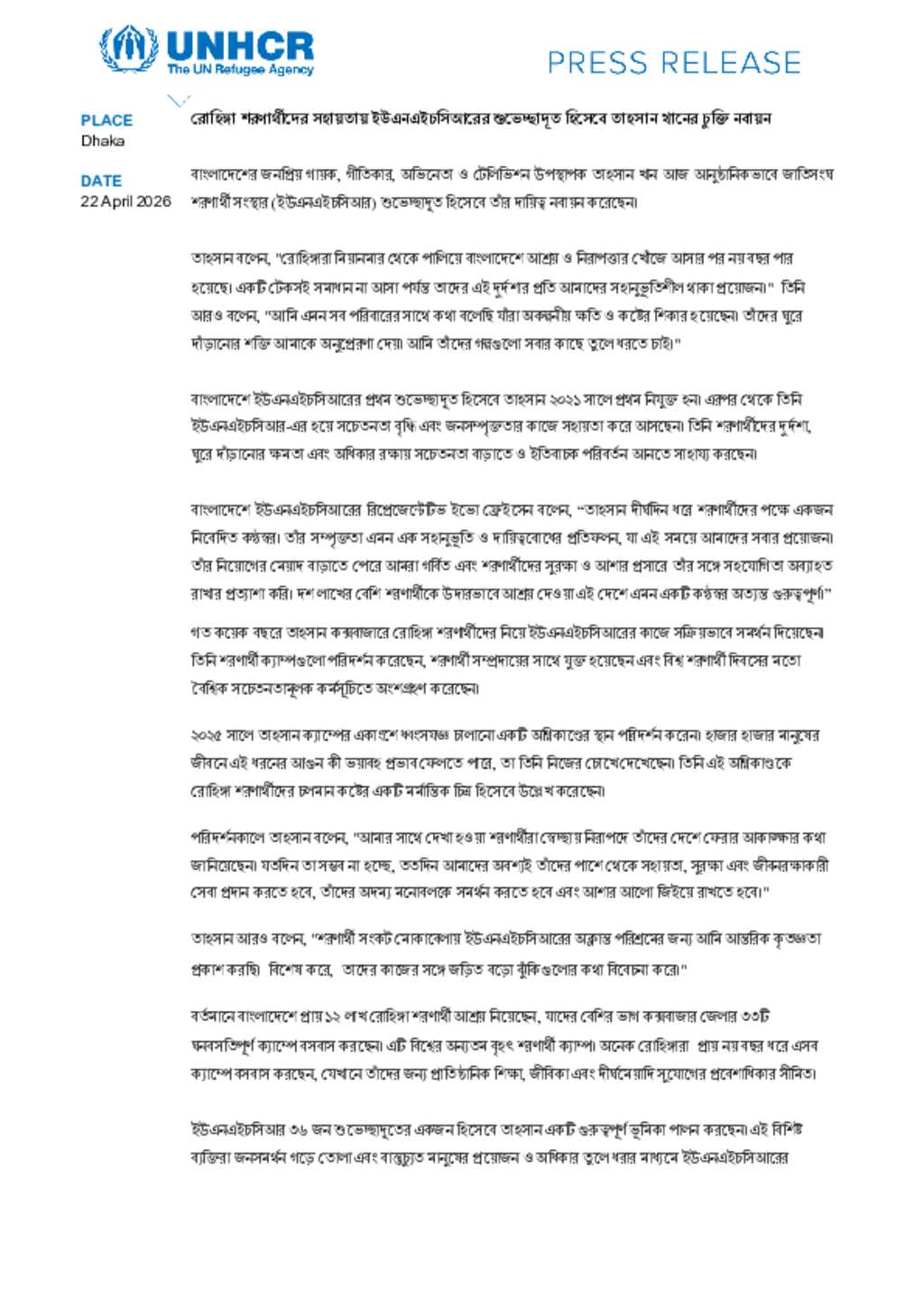 Bangladeshi artist and media personality Tahsan Khan has renewed his role as Goodwill Ambassador for UNHCR, reaffirming his commitment to standing alongside Rohingya refugees in Bangladesh. Since his appointment in 2021, Tahsan has played a key role in raising awareness, engaging the public, and amplifying the voices of displaced communities. As Bangladesh continues to host nearly 1.2 million Rohingya refugees, most living in Cox’s Bazar, his continued engagement highlights the importance of sustained compassion, protection, and global solidarity. Through field visits, advocacy efforts, and public outreach, Tahsan brings attention to the resilience of refugees while calling for durable solutions and renewed support for one of the world’s largest refugee populations.