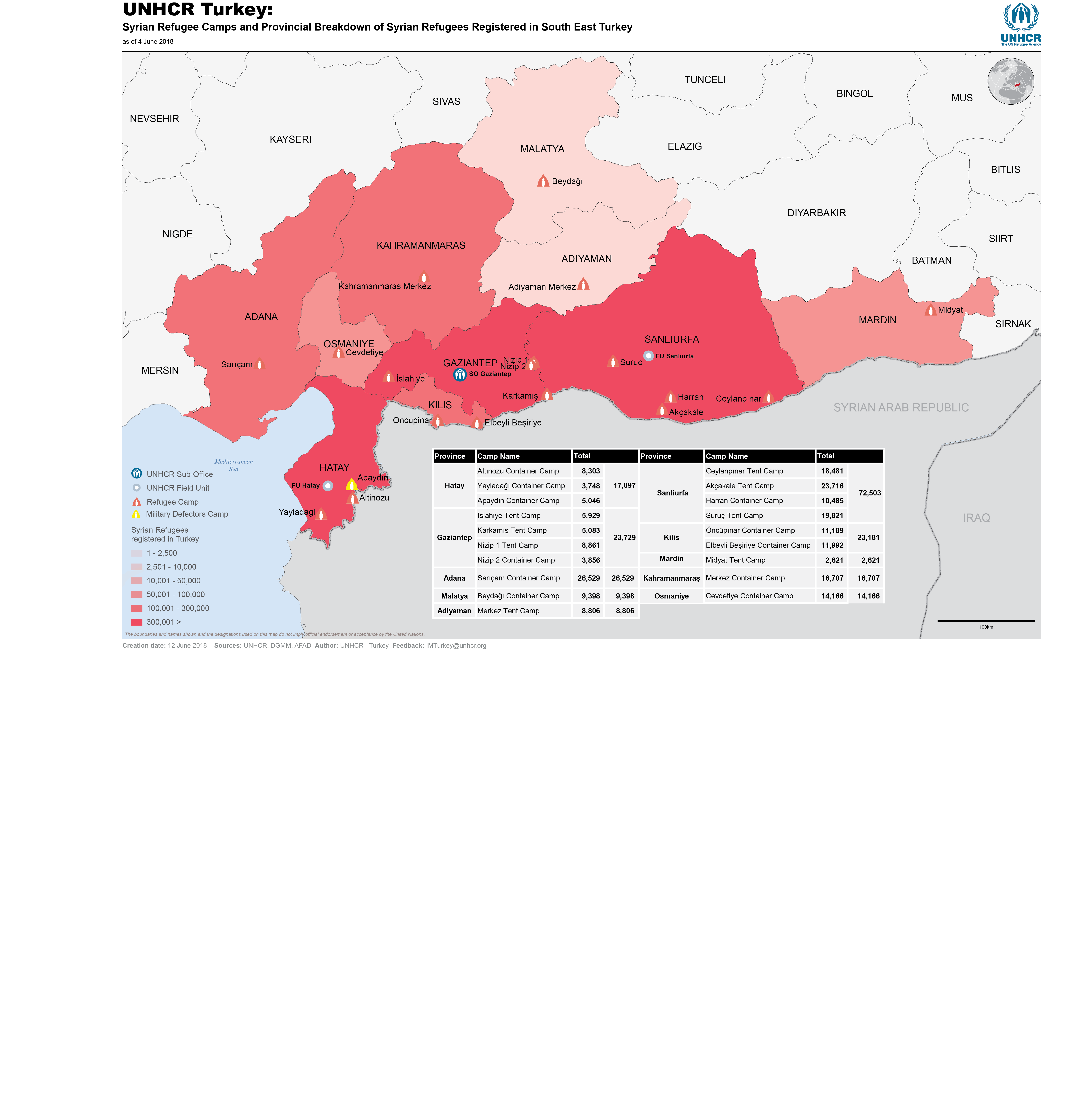 UNHCR Turkey: Syrian Refugee Camps and Provincial Breakdown of Syrian Refugees Registered in South East Turkey - June 2018