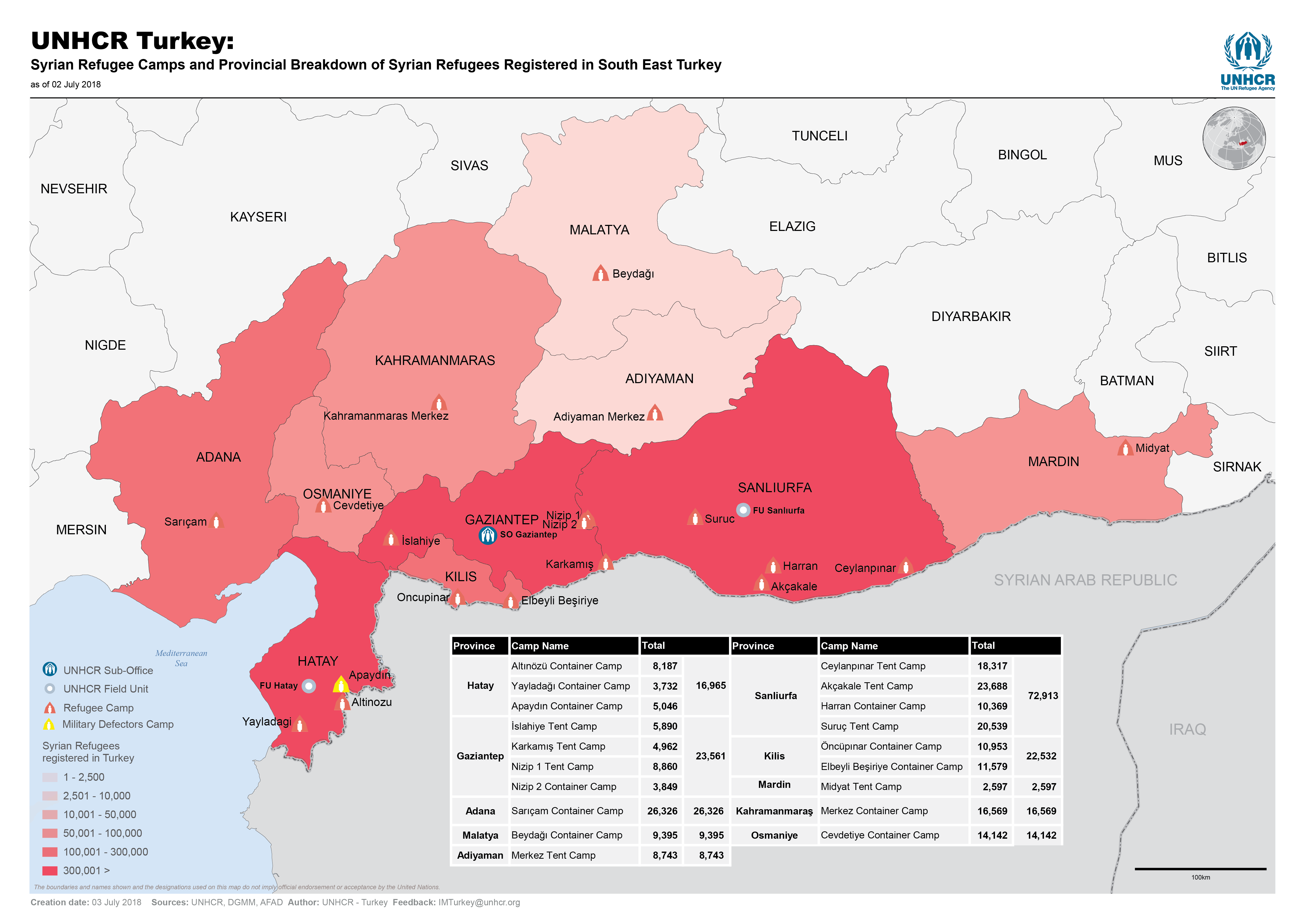 UNHCR Turkey - Syrian Refugee Camps and Provincial Breakdown of Syrian Refugees Registered in South East Turkey - July 2018