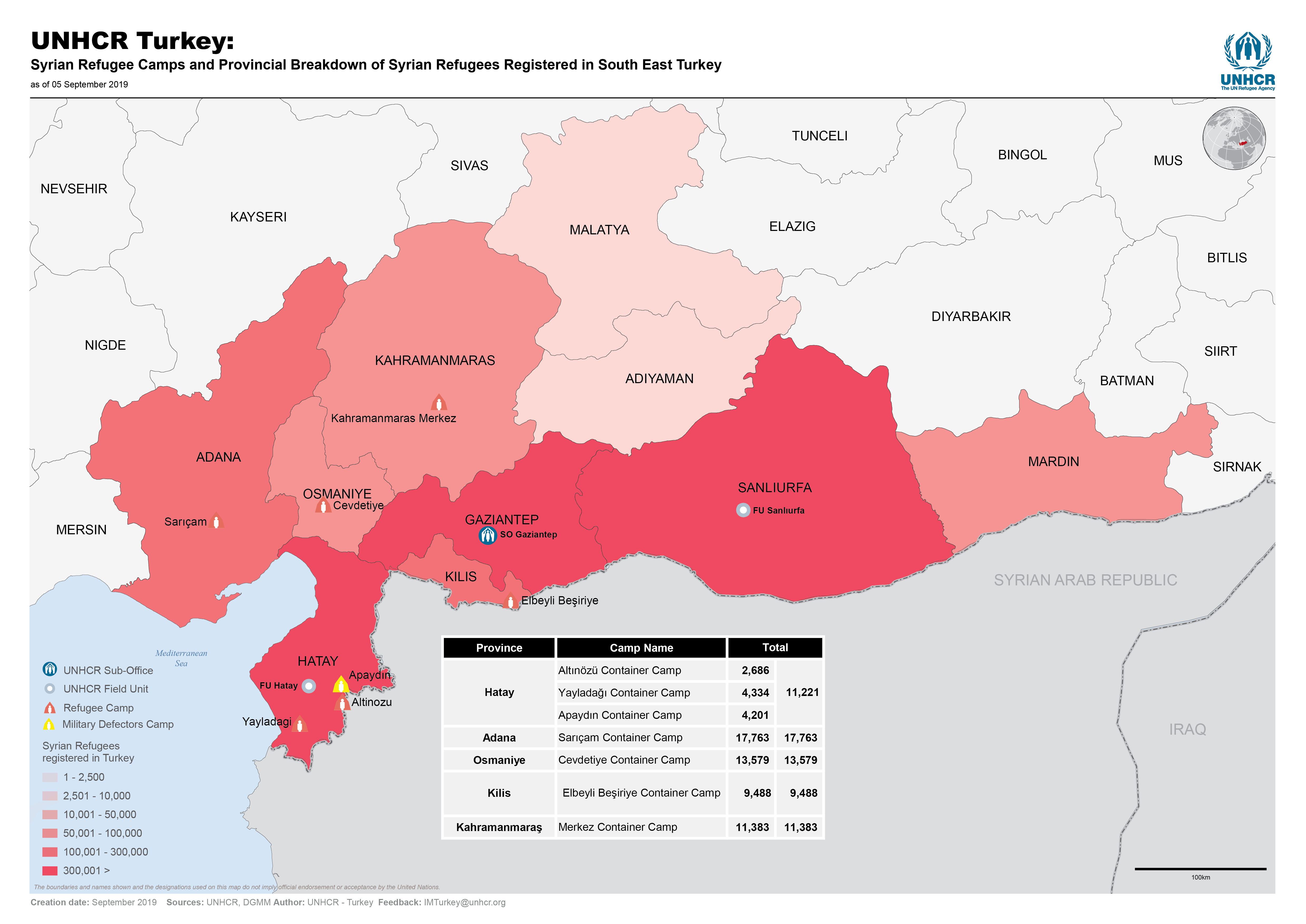 UNHCR Turkey: Syrian Refugee Camps and Provincial Breakdown of Syrian Refugees Registered in South East Turkey - September 2019