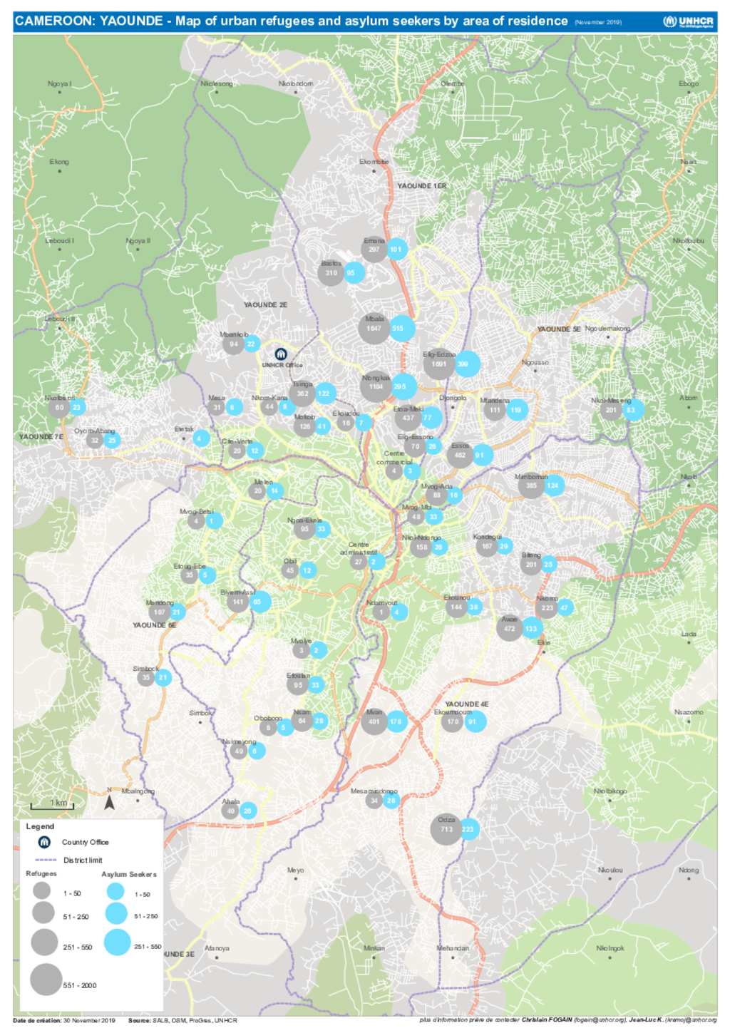 YAOUNDE - Map of urban refugees and asylum seekers by area of residence (November 2019)