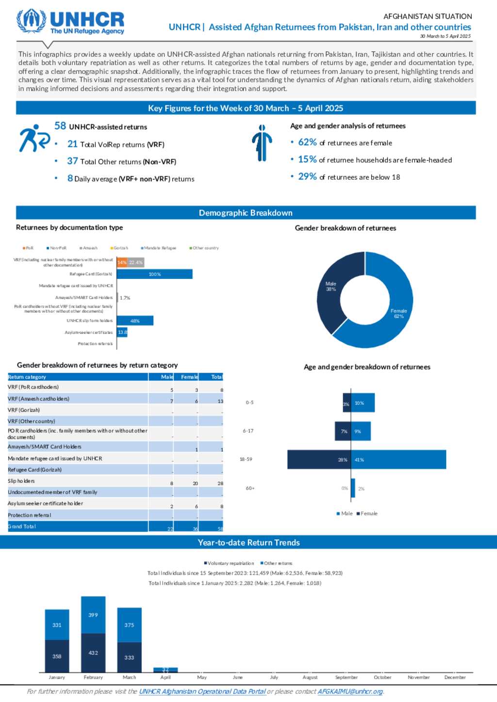 This dashboard provides a weekly update on UNHCR-assisted Afghan nationals returning from Pakistan. It details both voluntary repatriation as well as forced returns. It categorizes the total numbers of returns by age, gender and documentation type, offering a clear demographic snapshot. Additionally, the infographic traces the flow of returnees from January to present, highlighting trends and changes over time. This visual representation serves as a vital tool for understanding the dynamics of Afghan nationals return, aiding stakeholders in making informed decisions and assessments regarding their integration and support.