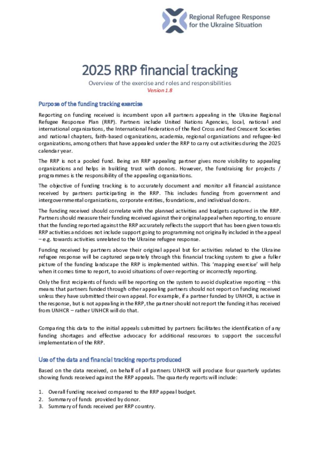Reporting on funding received is incumbent upon all partners appealing in the Ukraine Regional Refugee Response Plan (RRP). Partners include United Nations Agencies, local, national and international organizations, the International Federation of the Red Cross and Red Crescent Societies and national chapters, faith-based organizations, academia, regional organizations and refugee-led organizations, among others that have appealed under the RRP to carry out activities during the 2025 calendar year.