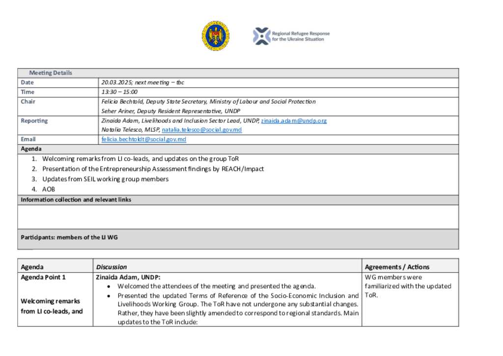 Ukraine situation: Moldova: Livelihoods and Inclusion Working Group Meeting Minutes (20 March 2025)
