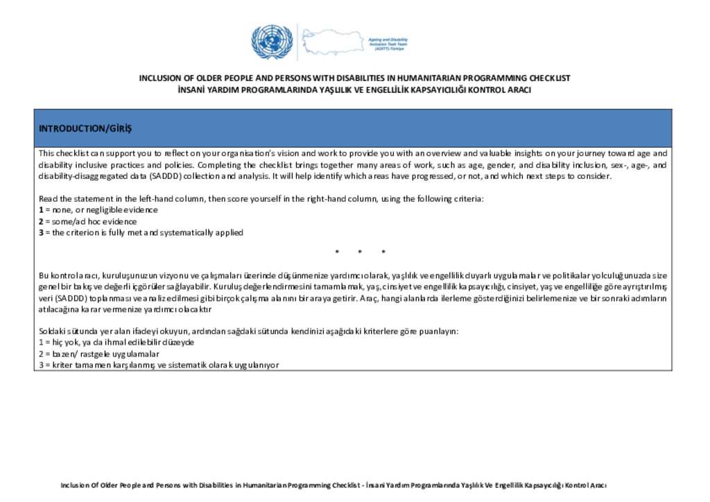 Türkiye: 3RP NPWG - ADITT - Inclusion of Older People and Persons with Disabilities in Humanitarian Programming Checklist / İnsani Yardım Programlarında Yaşlılık ve Engellilik Kapsayıcılığı Kontrol Aracı